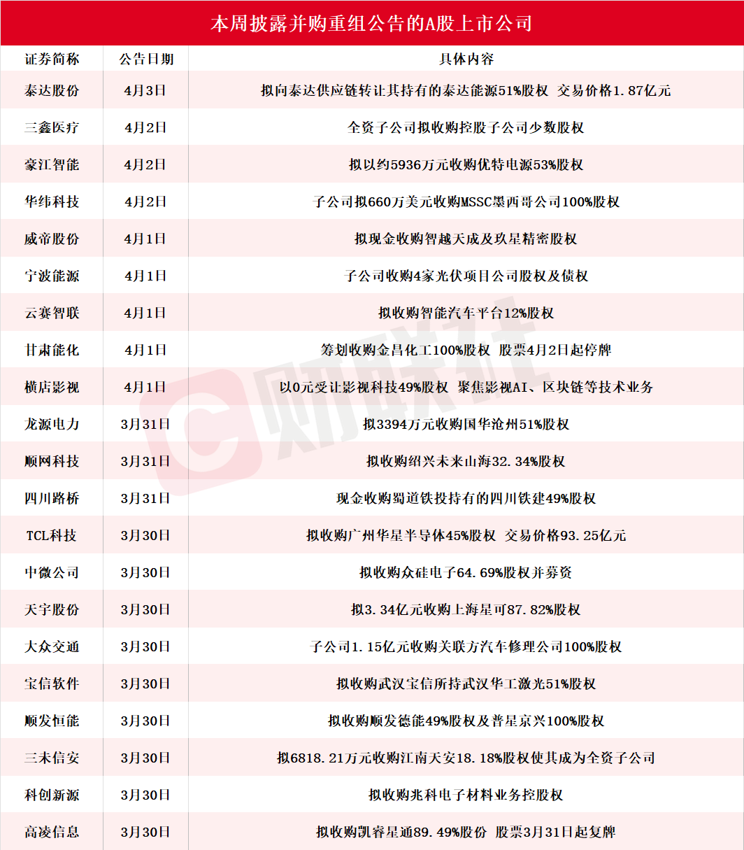 据财联社不完全统计,截至发稿,本周披露并购重组进展的A股上市公司共有21家,包括泰达股份、三鑫医疗、豪江智能、华纬科技、威帝股份、宁波能源、云赛智联、甘肃能化、横店影视、龙源电力、顺网科技、四川路桥、TCL科技、中微公司、天宇股份、大众交通、宝信软件、顺发恒能、三未信安、科创新源、高凌信息。具体情况如下图: