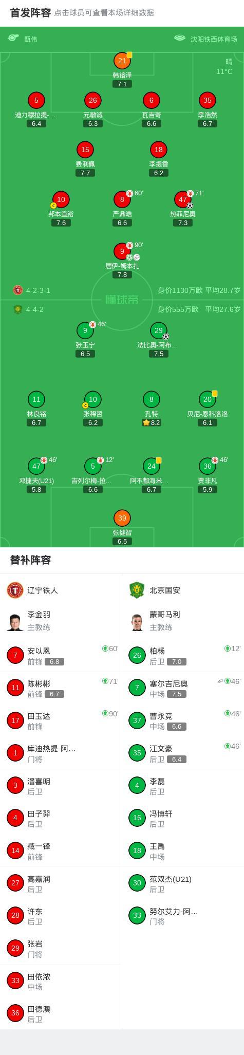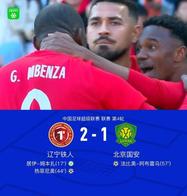 北京时间4月4日中国足球超级联赛 联赛 第4轮,辽宁铁人主场对阵北京国安。辽宁铁人居伊-姆本扎破门,热菲尼奥破门。北京国安法比奥-阿布雷乌破门。最终比分辽宁铁人 2-1 北京国安。