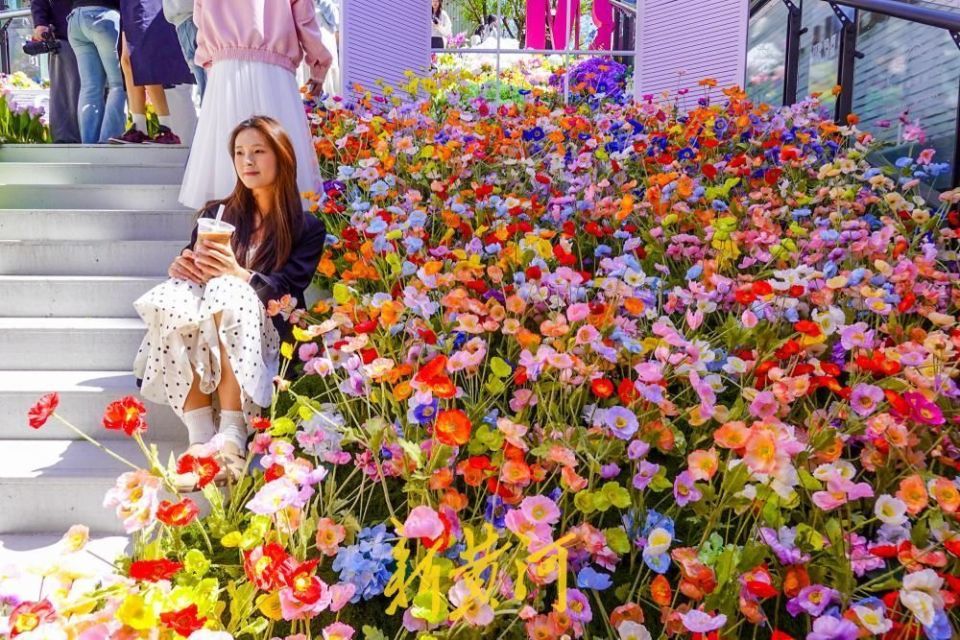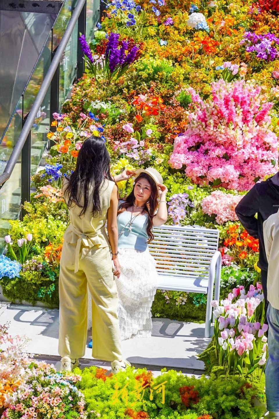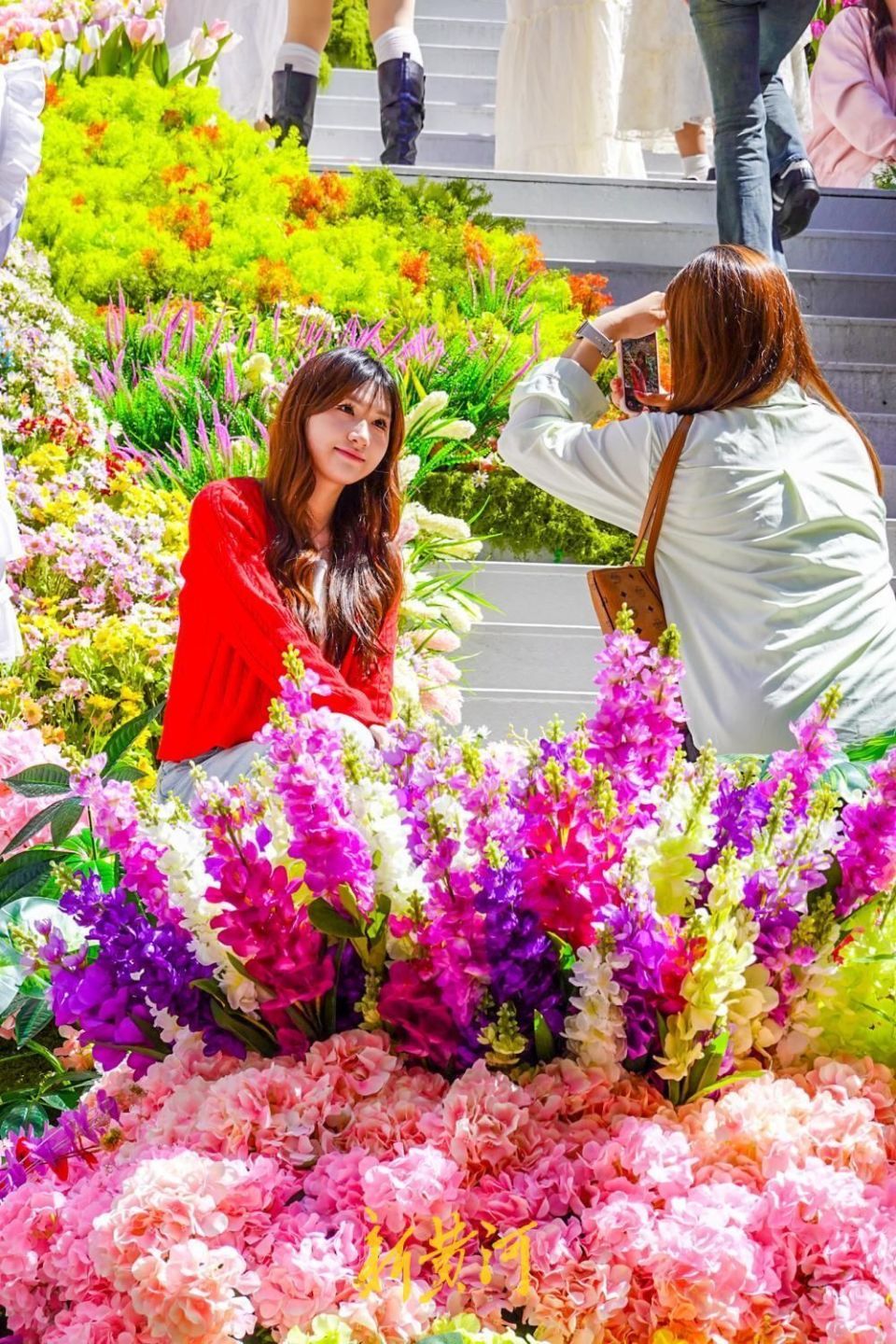 记者在现场看到,楼梯台阶上密集摆放了数十种色彩各异、形态逼真的绢花,从淡粉、明黄到深紫、亮红,层层递进、次第铺展。阳光洒落,花海与老商埠的红砖墙体、复古招牌形成鲜明对比,既有年代感,又充满春日的浪漫活力。现场随处可见三五成群的年轻人举着手机或相机,或蹲或站,寻找最佳角度。这场“视觉引流”很快转化为实际消费动力,据地下商场客流量明显增加,不少原本只是路过拍照的年轻人,被吸引顺台阶而下进入地下商业区,带动了饮品、饰品、文创等业态的销售。