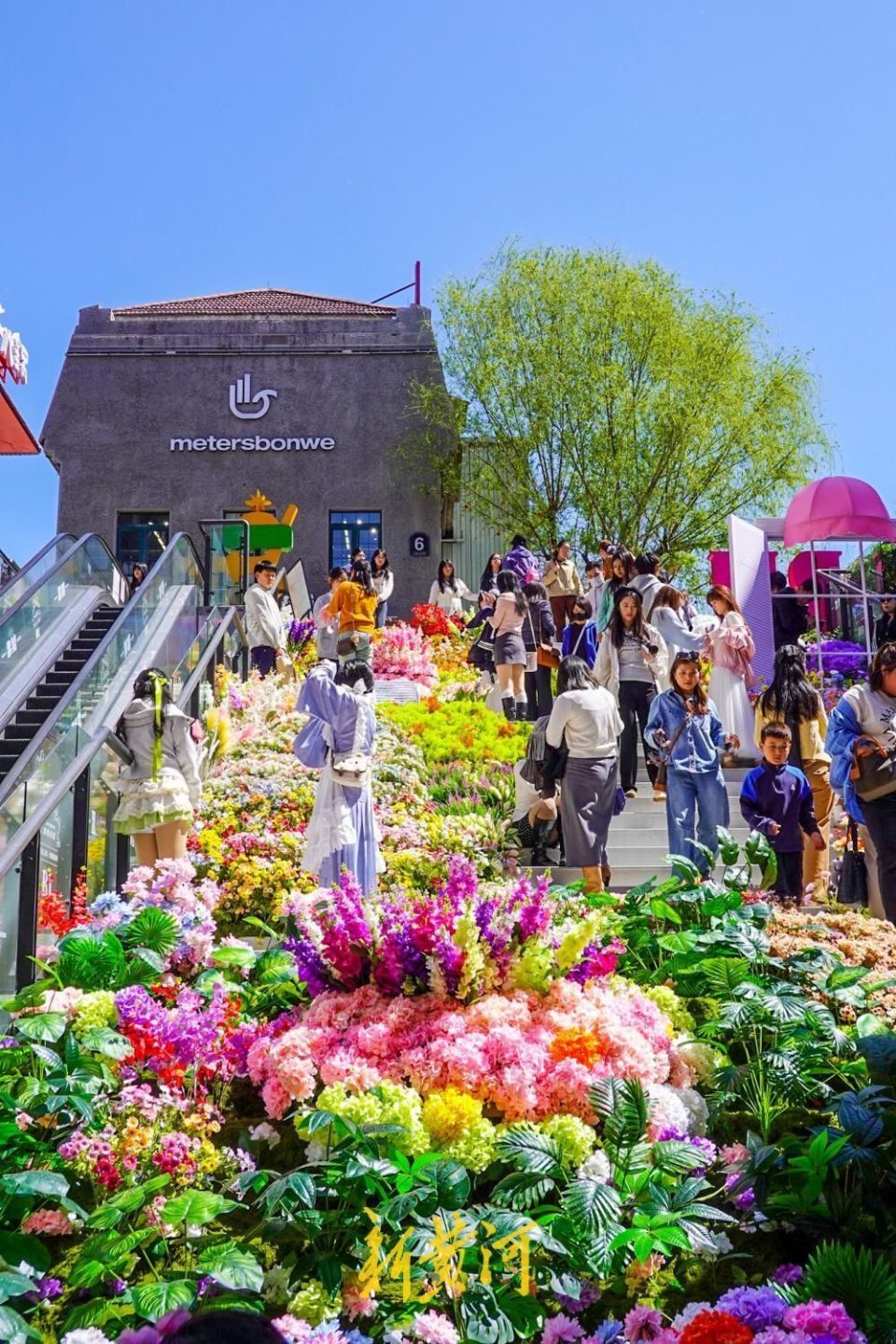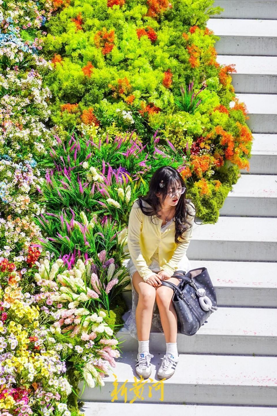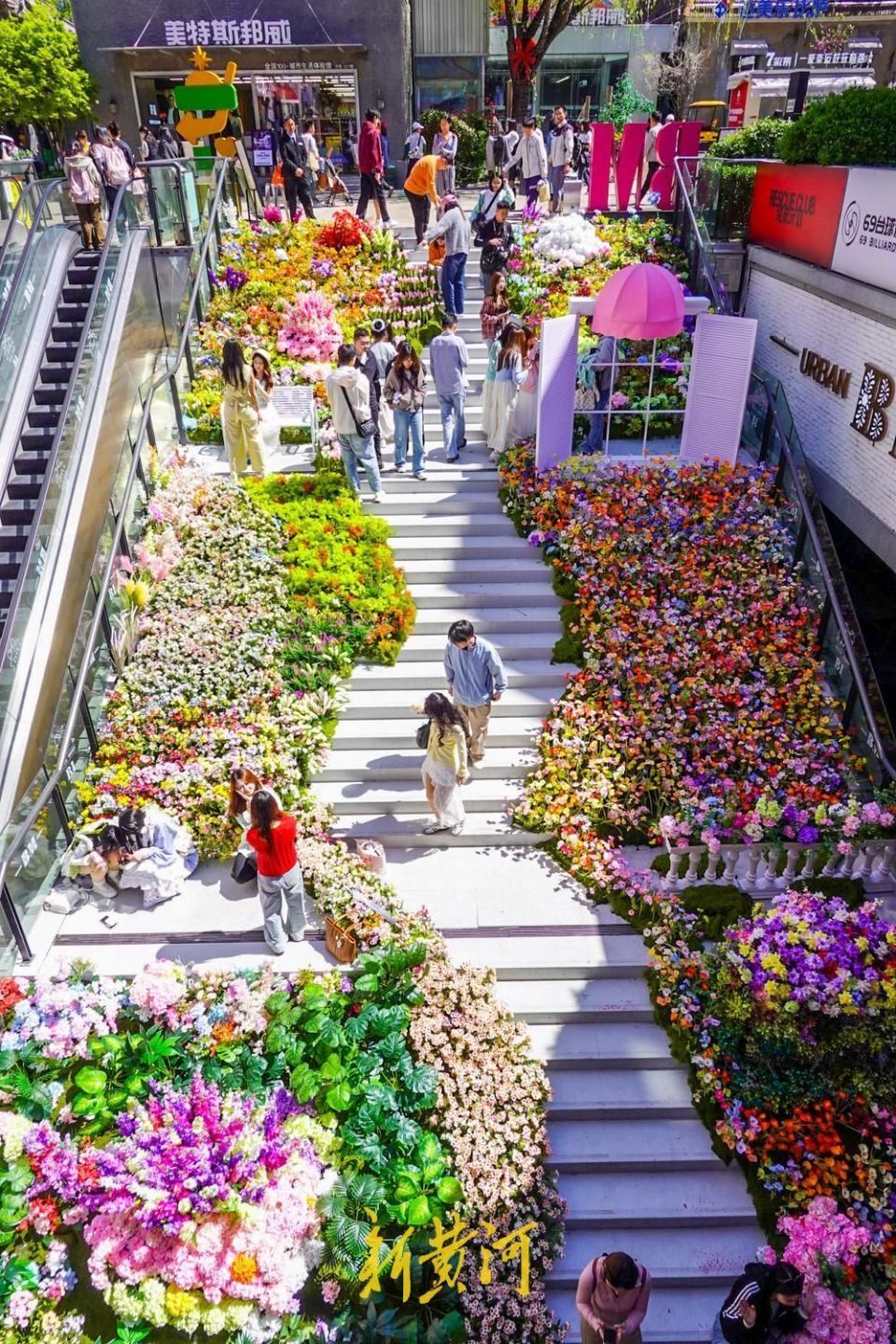 在蓝天映衬下,五颜六色的花朵格外艳丽,迅速成为年轻市民和游客争相打卡的热门地标,并成功带动地下商场消费升温。这处露天楼梯位于老商埠核心区域,是连接地面街区与地下商业空间的重要通道。
