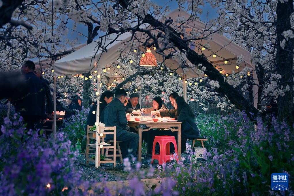 3月30日,游客在砀山县梨小萌欢乐梨园品尝梨园火锅。