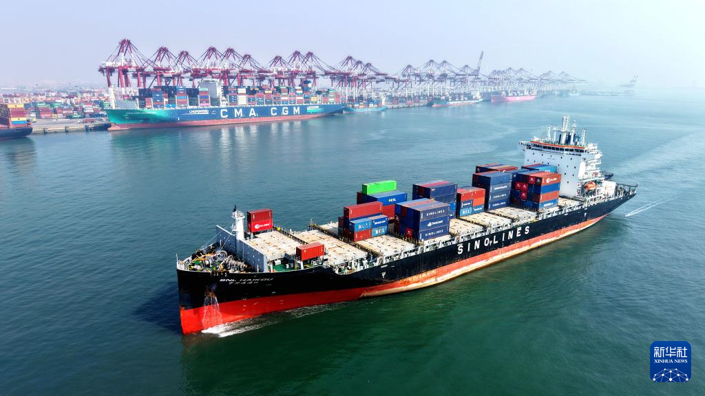 4月1日,在山东港口青岛港,一艘装载集装箱的货轮驶入港口(无人机照片)。2026年第一季度山东港口青岛港新开通7条集装箱航线。至此,青岛港一季度新开通航线已覆盖东南亚、澳大利亚、非洲、中南美等区域。