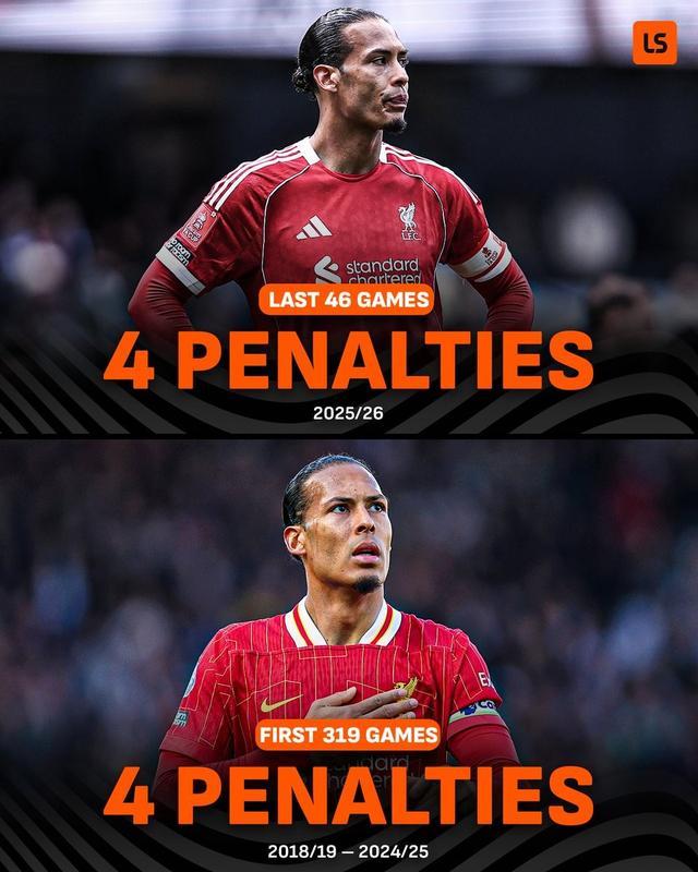 至此,范戴克本赛季各项赛事已送出了4次点球,这一数字与这位荷兰后卫红军生涯此前7个赛季(2018-19赛季至2024-25赛季)持平。