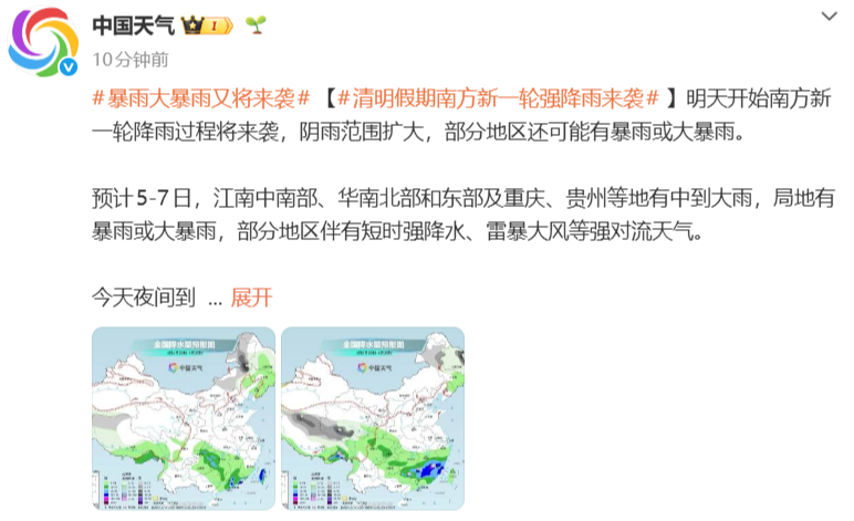 据@中国天气 5日开始南方新一轮降雨过程将来袭,阴雨范围扩大,部分地区还可能有暴雨或大暴雨。