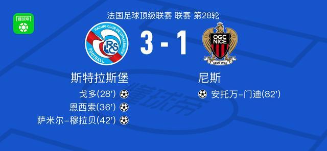 北京时间4月4日法国足球顶级联赛第28轮,斯特拉斯堡主场迎战尼斯。比赛中,斯特拉斯堡球员戈多率先破门,随后恩西索打入球队第二球,萨米尔-穆拉贝也贡献进球。尼斯方面,安托万-门迪打入球队唯一进球。最终比分定格为斯特拉斯堡3-1尼斯。