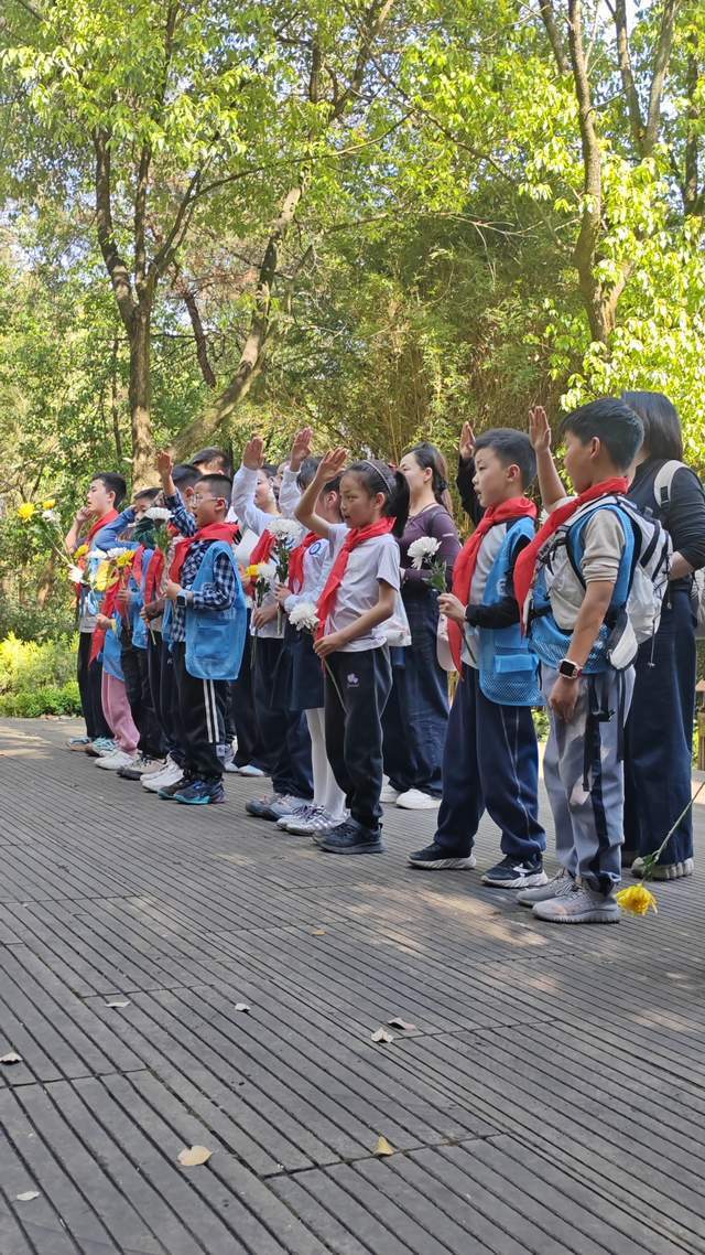 两名戴着鲜艳红领巾的9岁女孩,来到碑下献上鲜花,举手向先烈敬礼。