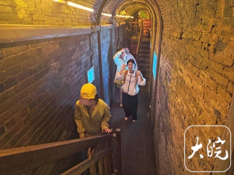 大皖新闻记者跟随人群走进地下运兵道,一股凉意扑面而来。狭窄的通道仅容两人并排通过,头顶是砖券拱顶,脚下是磨得光滑的青砖路面。“大家注意看,这里设有单行道、上下双层道,还有专门用于伏击的猫耳洞和陷阱。”讲解员的声音在通道中回荡,学生们围过来,有的掏出笔记本认真记录,有的举起手机拍照。