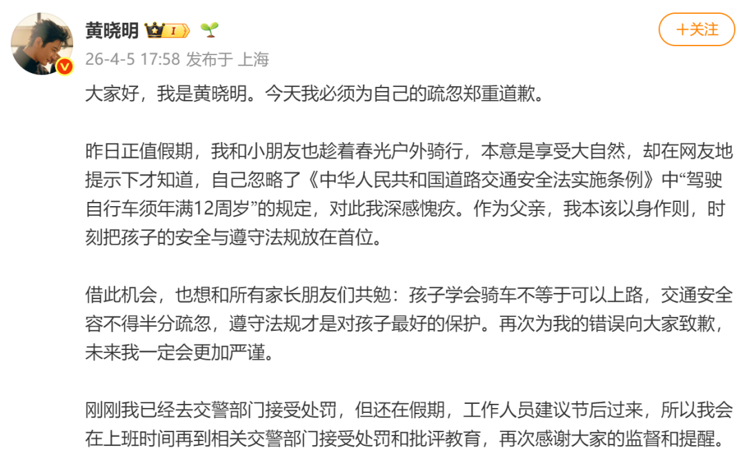 4月5日,黄晓明发文致歉: