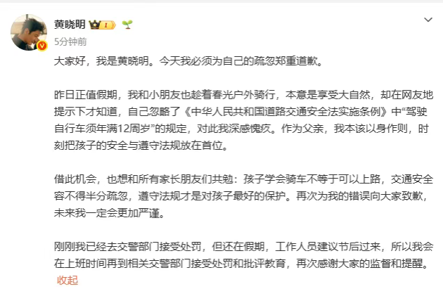 黄晓明本想晒父子骑行有多温馨,结果评论区变成普法现场。4月5日,#黄晓明带9岁娃骑行再温馨也违法#冲上微博热搜。