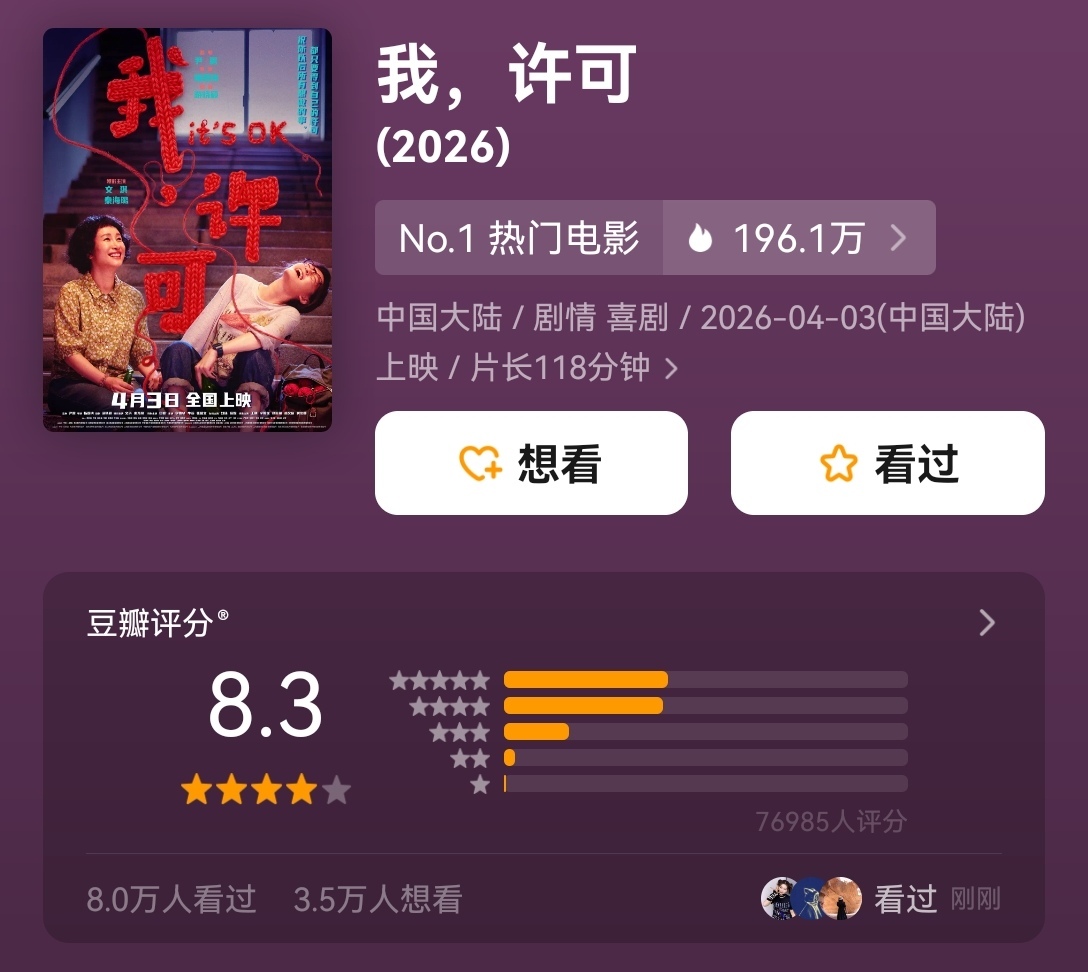 当然,这个阶段的这种激动,完全是可以理解的。因为很长阶段的那些偏见与视而不见,基本是不可理喻的。简单说,2026年至今豆瓣华语片最高分,我许可《我,许可》!