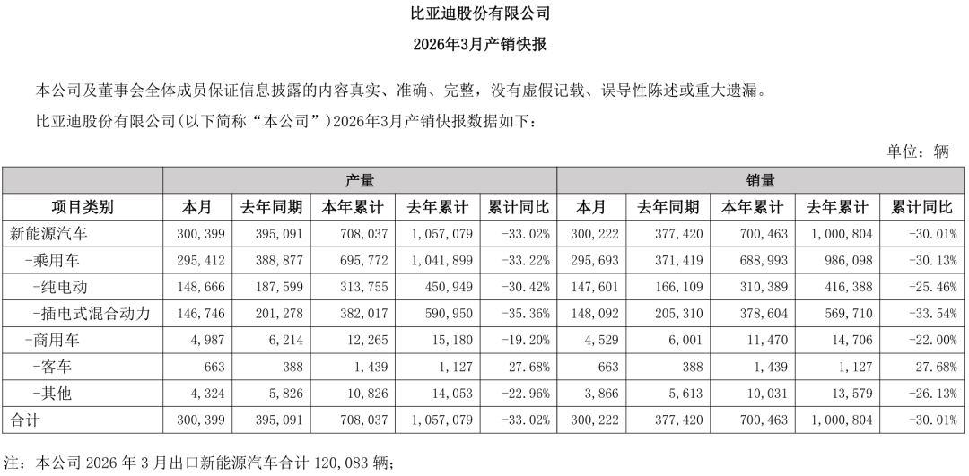 4月1日,比亚迪汽车对外公布2026年3月以及2026年一季度销量情况。数据显示,3月比亚迪汽车销量为300222辆,同比下滑20.45%,其中比亚迪乘用车销量为295693辆,纯电动车销量为147601辆,插电式混合动力销量为148092辆;出口新能源汽车销量为120083辆。