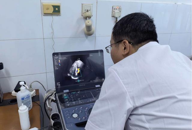 (▲周诚副主任医师操作便携式超声仪进行心脏彩超检查。)