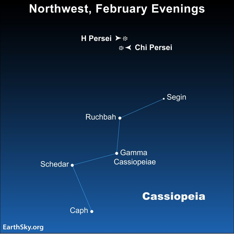 在北半球,天黑后你可以在北方找到仙后座。它是最容易辨认的星座之一M形中央的那颗星是仙后座γ星。图表由EarthSky提供。