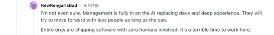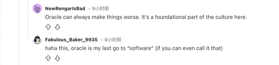 Reddit上有甲骨文员工一针见血地指出,管理层已经完全押注人工智能来取代开发人员和经验丰富的专业人士。只要技术上有一丝可能,他们就会毫无底线地用更少的人手向前推进,整个组织甚至在追求零人工参与的情况下发布软件,现在留在这里工作简直就像一场噩梦。