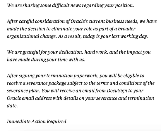 有甲骨文员工愤怒地爆料,整个过程没有HR的预警,没有直属领导的谈话,甚至连个最基础的Zoom会议都没有。很多人清晨醒来,就发现一封冰冷的程式化邮件静静躺在收件箱里,宣告自己被正式辞退。