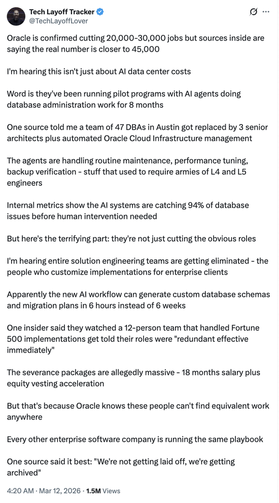 据内部人士透露,在奥斯汀的一个拥有47名DBA(数据库管理员)的庞大团队,如今已经被区区3名高级架构师加上OCI自动化管理系统彻底取代。这些不知疲倦的AI代理可以完美处理94%以上的数据库常规维护、性能调优和备份验证,而这些工作在以前需要成群结队的L4和L5级别工程师才能完成。