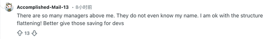 当然,在极度的焦虑中也有人对这种扁平化做法持妥协态度。有员工苦笑感叹,自己头上的经理实在太多了,很多人甚至连自己的名字都叫不上来,如果裁员能带来更扁平的结构倒也可以接受,只求公司能把省下来的钱真正分给还在干活的开发人员。