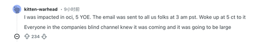 一位在甲骨文OCI部门工作了5年的老员工在Reddit上大吐苦水,他表示解雇邮件是在太平洋时间凌晨3点统一发给所有美国员工的,而身处中部时间的他早上5点醒来就遭受了这当头一棒。