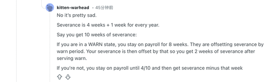 不仅赔偿基数少得可怜,甲骨文还被曝出极其鸡贼地利用WARN法案(裁员预警法)来变相抵消补偿金。有Reddit用户详细拆解了这个陷阱,如果你身处有WARN法案强制要求的州,公司会让你名义上留在工资单上8周。但恶劣的是,他们会直接用这8周的预警期来抵消你的遣散费。打个比方,如果按工龄算下来你有10周的补偿金,在硬熬完这8周的WARN期后,你最终只能拿到可怜的2周真实现金遣散费。这种玩弄规则的冷血操作,彻底粉碎了补偿金本该具有的安抚作用。