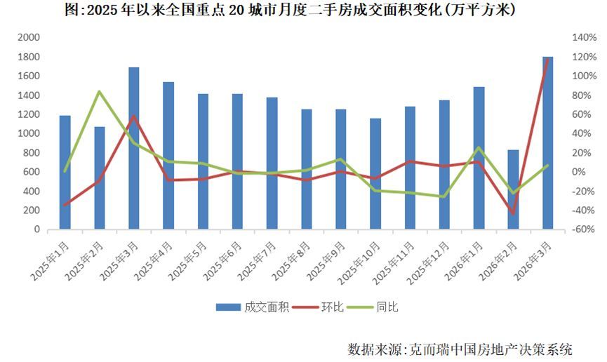 今年一季度,内地二手房产交易迎来小阳春。克而瑞报告显示,3月重点20城二手房成交面积约1797万平方米,环比增长117%,同比亦增长6%;一季度累计成交面积约4108万平方米,同比增长4%。