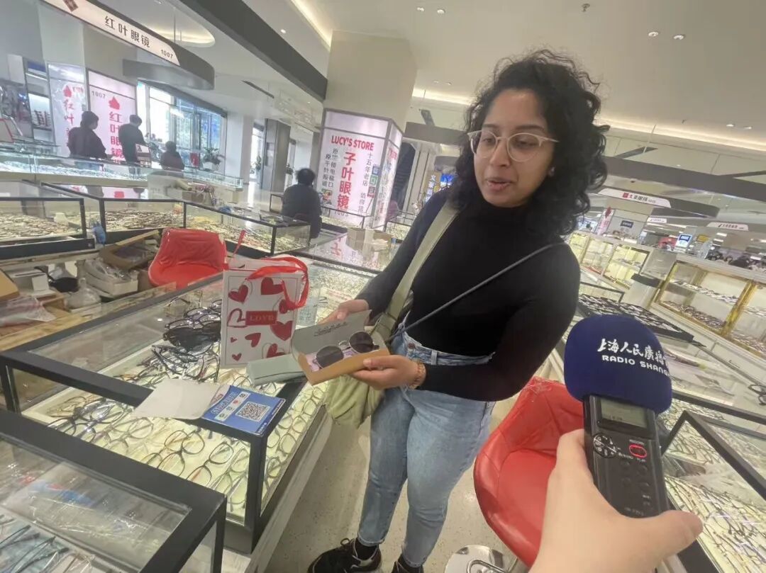 在国际眼镜城里,随处可见外国人或在柜台前驻足挑选,或在镜子前试戴眼睛,或在机器前验光,来自英国的Benny原本只想试一试,忍不住一口气买了三副。“我原本只是想试一下,没想到它们看起来都不错,很漂亮,我就决定都买了。”