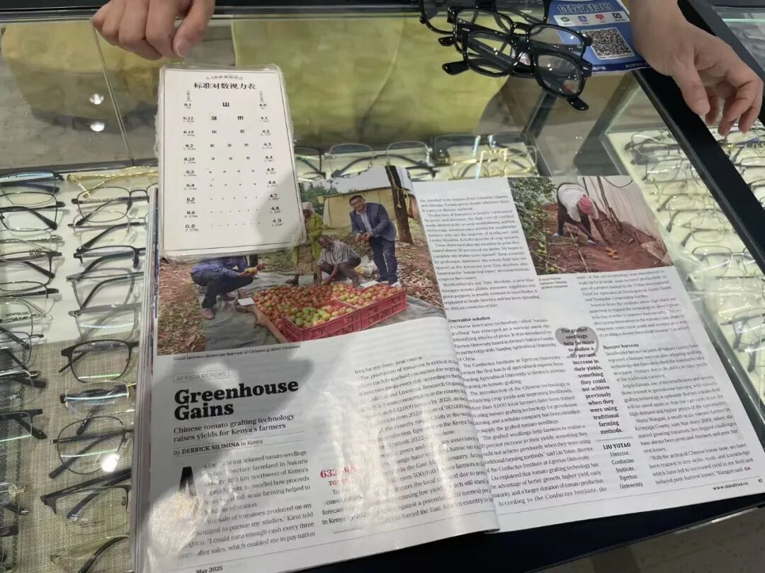 Talitha对新镜片很满意,童庆英又拿出一本英语杂志再次让她确认清晰度,并告知大约2小时后就能取到新眼镜。等待的过程中,儿子Charlie也看中了两幅眼镜。Charlie说,这里比澳大利亚有更多的产品品类可供挑选,而且便宜很多。