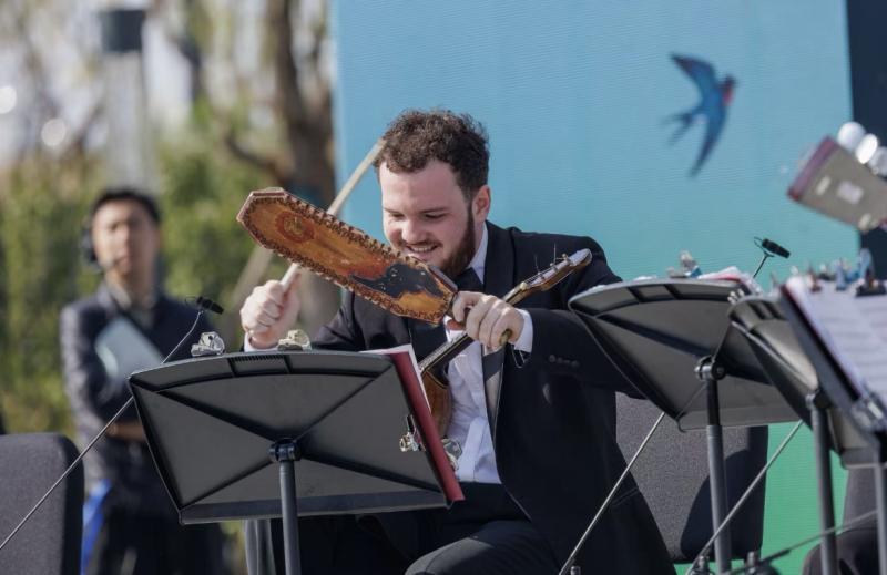 这场露天音乐会的“亲切”,不只在于春光的陪伴,更在于其精心融入的中国元素。当俄罗斯的青年独奏家们共同奏起由中国作曲家姜莹创作的《丝绸之路》时,熟悉的东方旋律通过巴拉莱卡琴、多姆拉琴等俄罗斯乐器重新演绎,产生了一种奇妙的“化学反应”。最后,一曲家喻户晓的《花好月圆》在欢乐中奏响,别具一番轻柔韵味。这首象征团圆美满的中国名曲,由远道而来的俄罗斯音乐家们在阳光下倾情演绎,成为了中俄两国人民友谊美好绽放的动人象征。