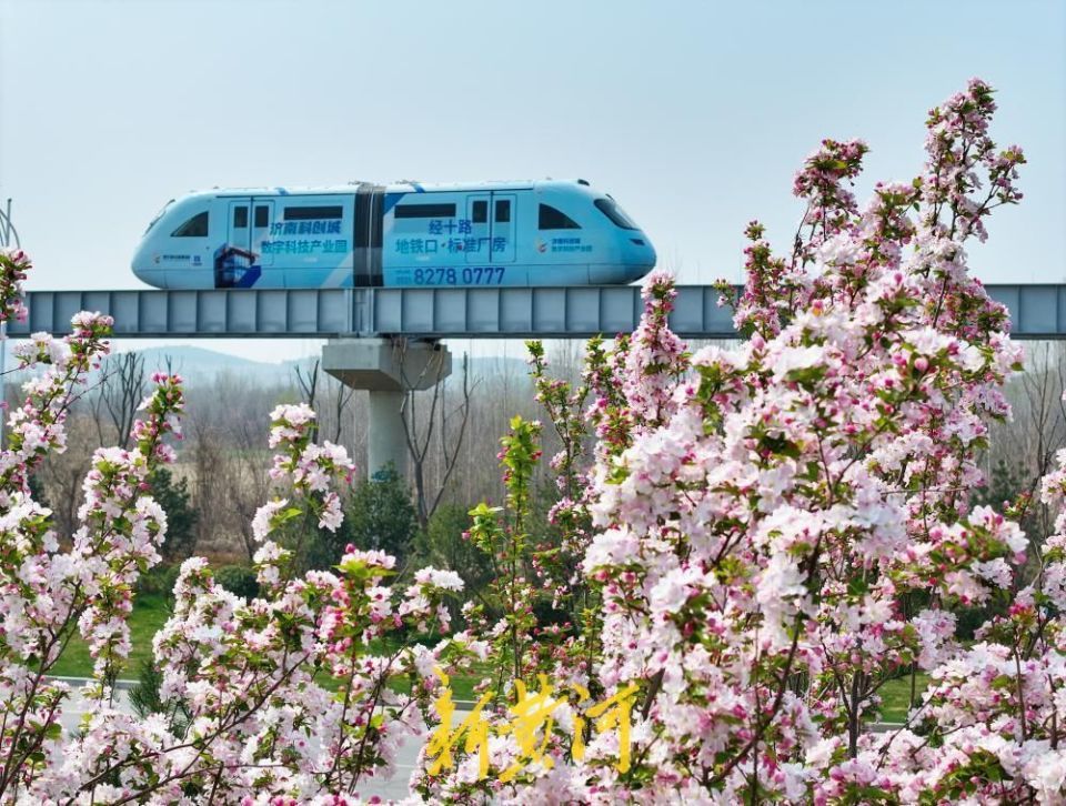 作为济南首条云巴线路,这条“空中走廊”不仅串联起城市脉络,更成为市民踏青赏春的移动观景台。云巴所经之处,粉白海棠花如云似霞,金黄连翘缀满枝头,与嫣红碧桃交相辉映,构成一幅生机勃勃的都市春景图。
