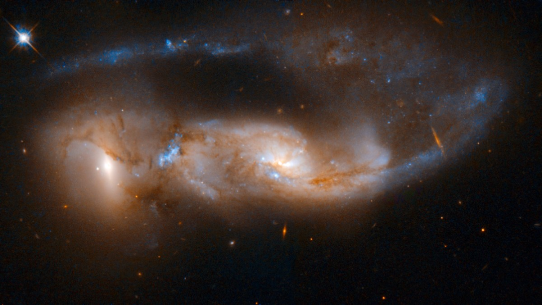 哈勃太空望远镜至今已开展科学研究36年。在其运行生涯的一半时,它曾拍摄到59个星系合并的独立实例,包括此处展示的Arp81。星系NGC6621和NGC6622仍可辨认,但大量的恒星形成、潮汐剥离和气体消耗是这种相互作用的明显迹象,其最终结果仍未明确。