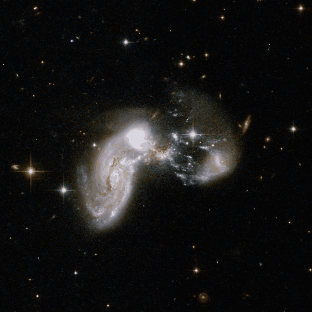当星系重叠、相互作用或合并时,它们的形状会发生显著变化。