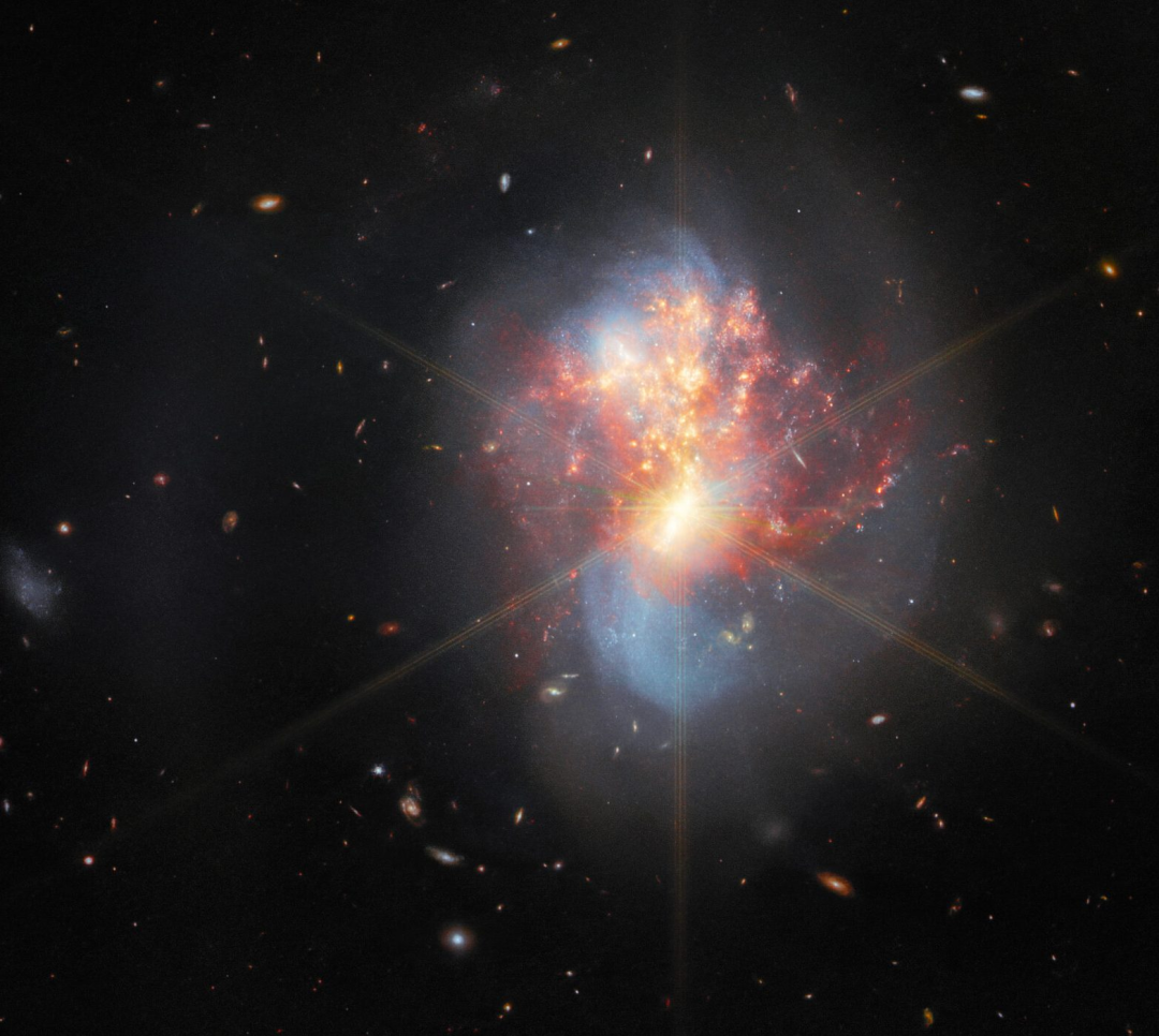 正在合并过程中的一对相互作用星系(被称为IC1623)由JWST在此处成像。这张图像的构建使用了JWST的三种仪器——MIRI、NIRSpec和NIRCam的数据。中心持续的星暴产生强烈的红外辐射。在早期宇宙的星系中,整个星系本身可能经历一次星暴,此时恒星在整个星系范围内同时形成,尽管这一过程仅持续很短的时间。图片来源:R。Colombari