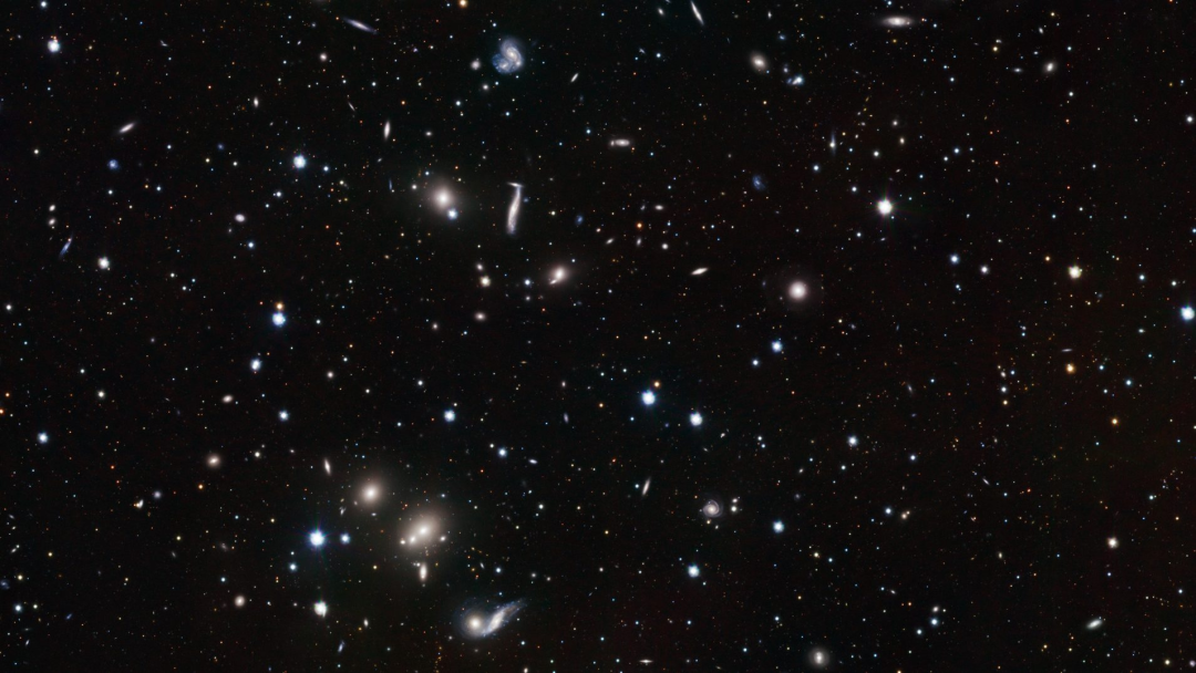 宇宙中已知的大多数最大星系都位于大质量星系团的中心,比如这里展示的武仙座星系团。随着时间推移,这些星团内的星系会发生碰撞和合并,这会引发新的恒星形成爆发,但总体上会使星系变得更缺乏气体。经过足够长的时间(比宇宙当前年龄更长)后,这类星团中的大多数星系将变成巨型椭圆星系,而不是在我们现代宇宙中仍是大型大质量星系最常见类型的含盘螺旋星系。图片来源:OmegaCenAstroWISE卡普坦研究所