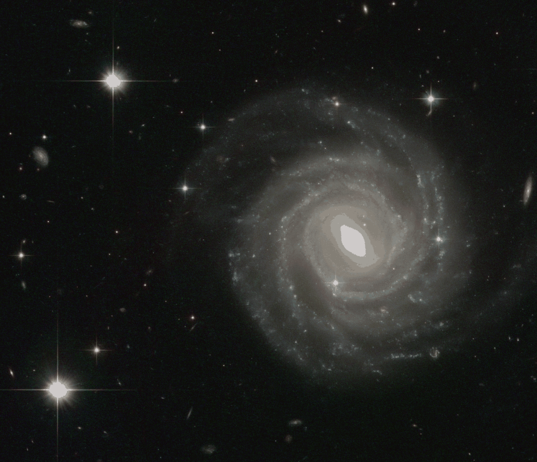 螺旋星系UGC12158拥有旋臂、棒状结构和短枝,以及较低且平缓的恒星形成速率,还带有中央核球的迹象,可能是迄今为止发现的与我们银河系最相似的单一星系。它既未与附近任何相邻星系发生引力相互作用,也未与之合并,因此其内部发生的恒星形成主要由星系盘旋臂内的密度波驱动。来源:欧洲空间局哈勃与美国国家航空航天局