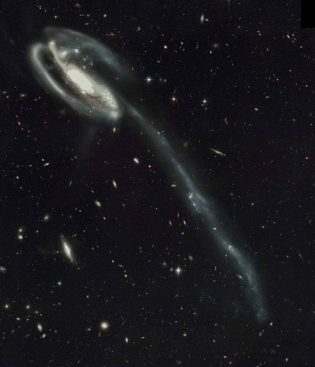 当一个星系对另一个星系施加潮汐力时,它们的形状往往会发生扭曲。
