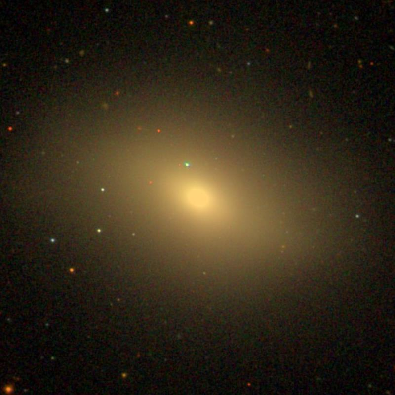 图中所示的巨型椭圆星系NGC584已被发现并记录,距离地球约6200万光年。尽管它曾长期未被确认为河外星系天体,但在NGC1被发现前,它曾短暂是已知并记录的最遥远天体。其恒星分布在类似核球的晕中,内部几乎没有或完全没有气体和恒星形成物质。图片来源:斯隆数字巡天。