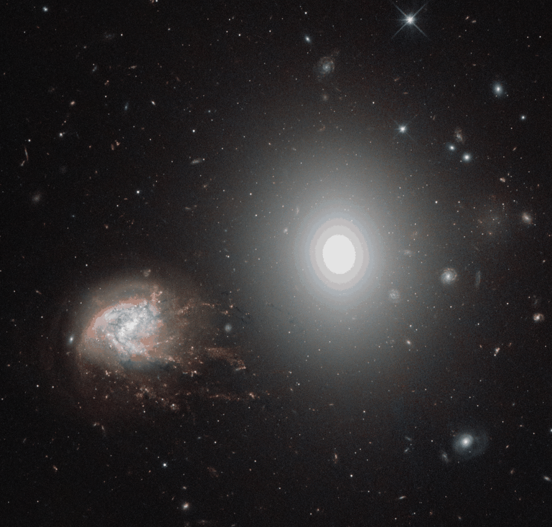 由哈勃空间望远镜拍摄的这张图像显示了巨型椭圆星系NGC4860及其擦肩而过的邻居——快速移动的螺旋星系NGC4858。这两个星系都位于Coma星系团中,但NGC4858很特别:它最初是一个与星系团内介质相互作用的螺旋星系。图片来源:ESAHubble&NASA