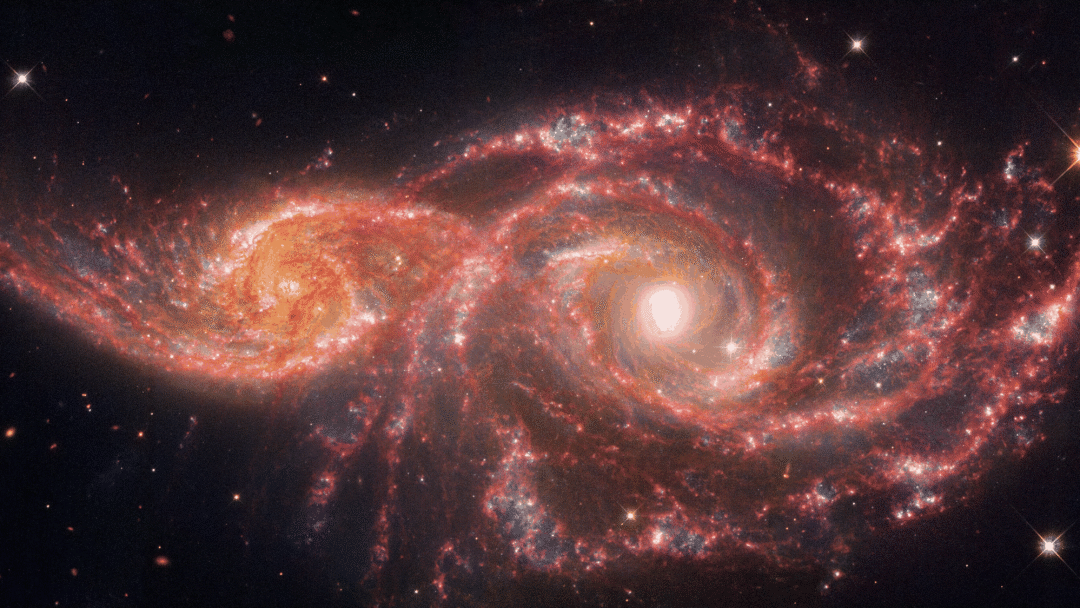 这些并非从太空深处凝视我们的一双眼睛,而是一对相互作用的螺旋星系,由于彼此间的引力牵引,它们的恒星形成速率有所提高。这张合成图像结合了詹姆斯韦伯空间望远镜(JWST)的中红外数据以及哈勃太空望远镜的可见光和紫外数据,其中较红的区域显示了正在进行的恒星形成活动。图片来源:美国国家航空航天局(NASA)、欧洲空间局(ESA)、加拿大空间局(CSA)、太空望远镜科学研究所(STScI)