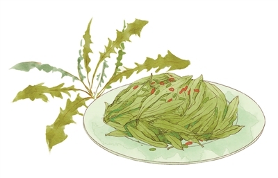 凉拌苦菜苦菜切去根部弃掉干叶,清洗干净,用手轻轻攥出水分后切成段。小碗中倒入适量生抽、陈醋、一勺白糖和少许盐,淋少许香油搅匀做成调料汁。可以根据个人口味,放一些炸花生米、豆腐干,或将皮蛋切成小块一起拌。