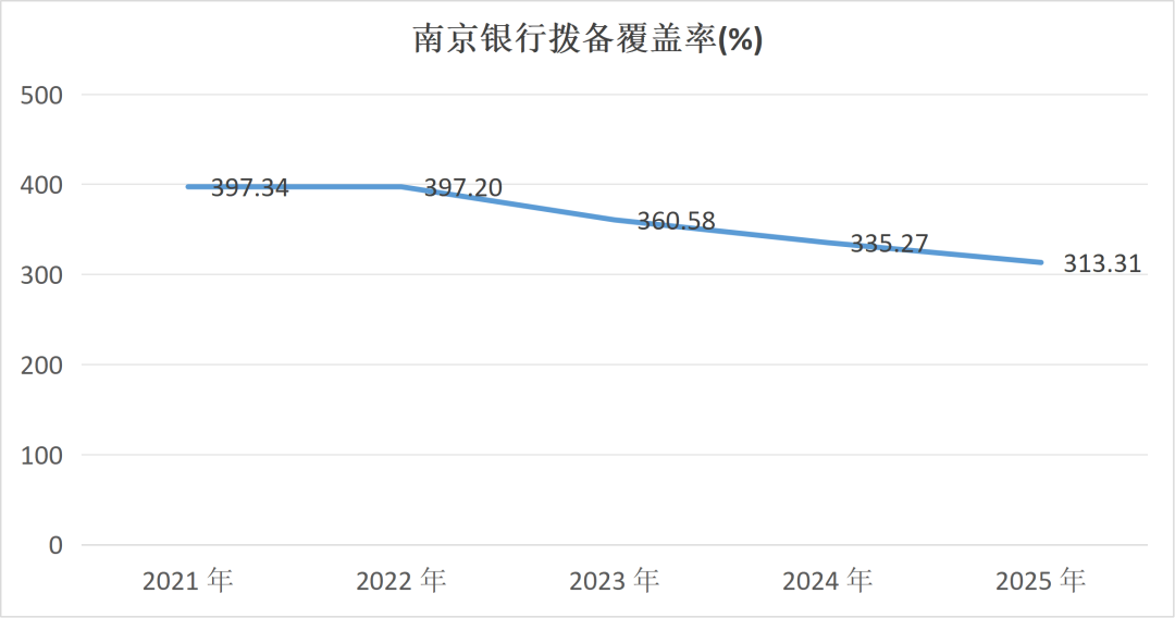 拨备覆盖率是风险抵补的核心指标,南京银行面临该指标持续下滑的压力。2025年末,该行拨备覆盖率为313%,较2024年末大幅下降约22个百分点,且连续多年下行。这背后是资产质量管控与盈利目标的深度考验。