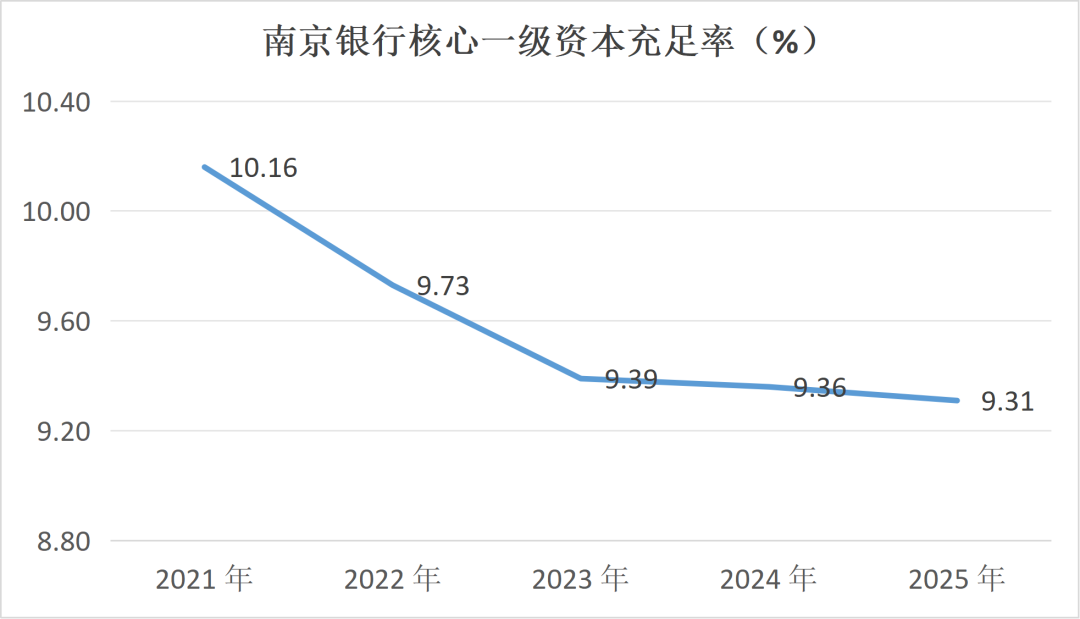 根据业绩快报,截至2025年末,南京银行核心一级资本充足率更是降至9.31%,虽仍高于监管红线,但在城商行中处于较低水平,且低于同期商业银行10.9%的平均水平。