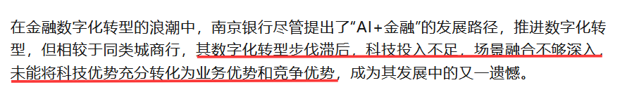 南京银行近年来也在努力弥补数字化转型方面的不足,如携手火山引擎落地智能体,推出“大模型双百计划”推动金融科技升级,但整体仍处于初级阶段。