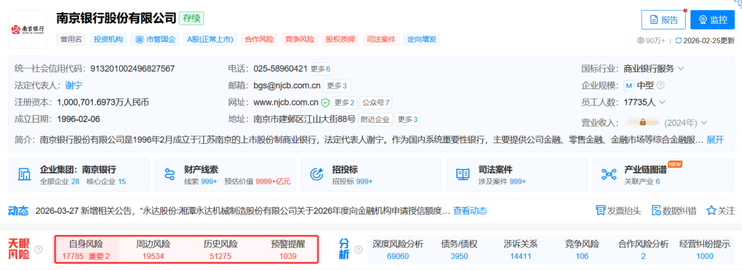 此外,天眼查显示,南京银行的自身风险、周边风险及历史风险数量多达数千或上万条,若想实现稳健发展,风控方面也有一些短板待补。