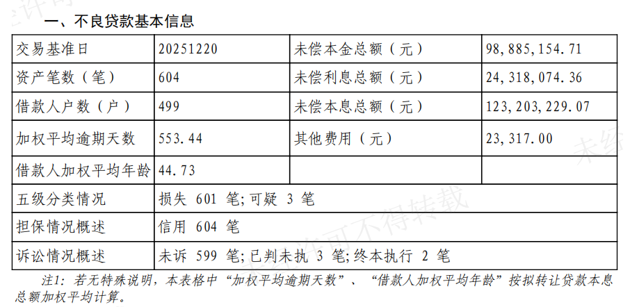 2026年2月,南京银行挂牌转让“2026年第1期个人不良贷款”资产包,涉及604笔不良贷款、未偿本息总额1.23亿元。其中,加权平均逾期天数高达553天,损失类贷款占比超过99%。