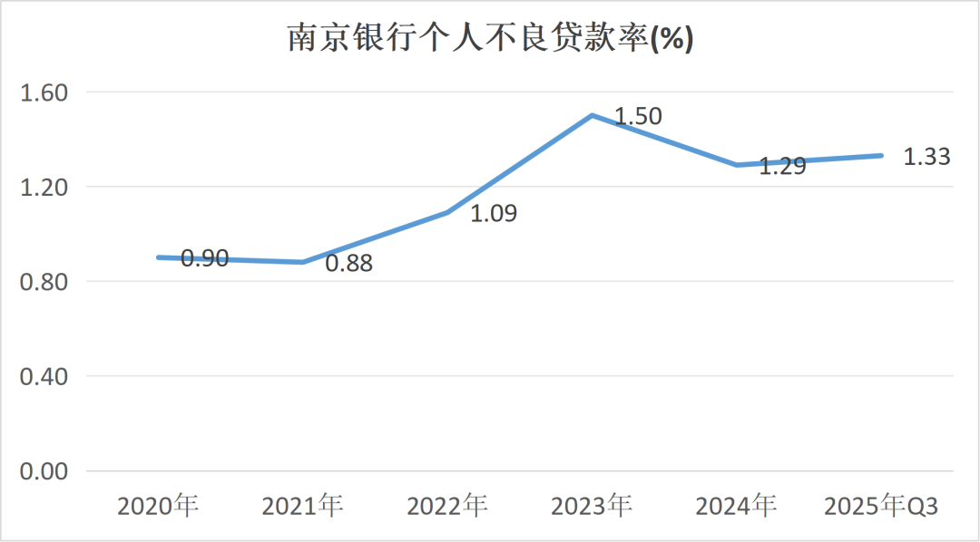 数据显示,南京银行个贷不良率从2020年的0.9%一路攀升至2023年的1.5%,虽此后有所回落,但截至2025年三季度末仍达1.33%。