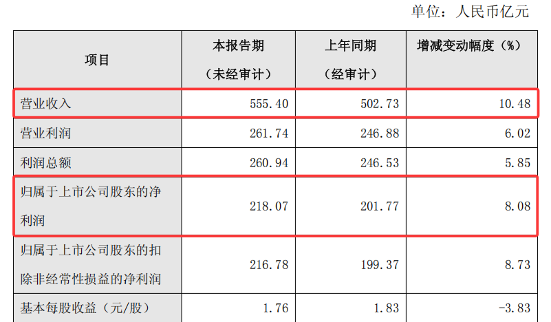 业绩快报显示,2025年该行营收555亿元,同比增长10%;归母净利润218亿元,同比增长8%。