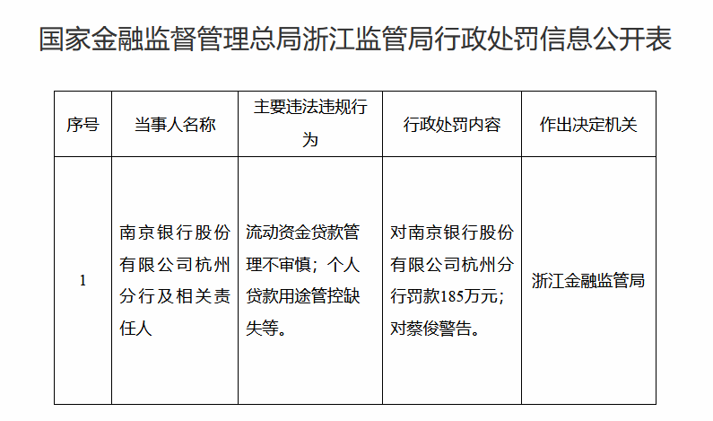 3月19日,国家金融监督管理总局浙江监管局官网显示,南京银行杭州分行因流动资金贷款管理不审慎、个人贷款用途管控缺失等违法违规行为,被罚185万元,相关责任人蔡俊被警告。