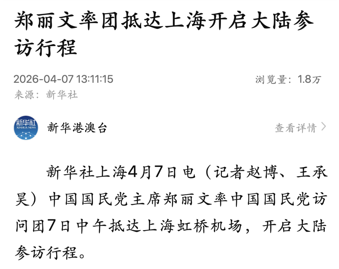 据参考消息援引台湾联合新闻网4月6日报道,中国国民党主席郑丽文将于4月7日正式开启访问大陆的旅程,首站将抵上海。