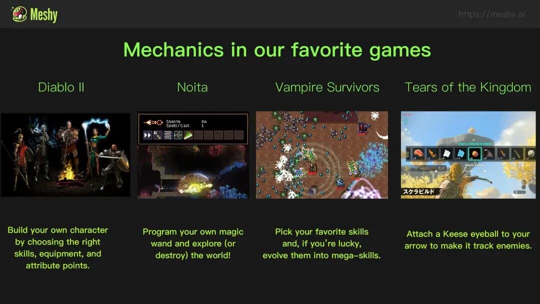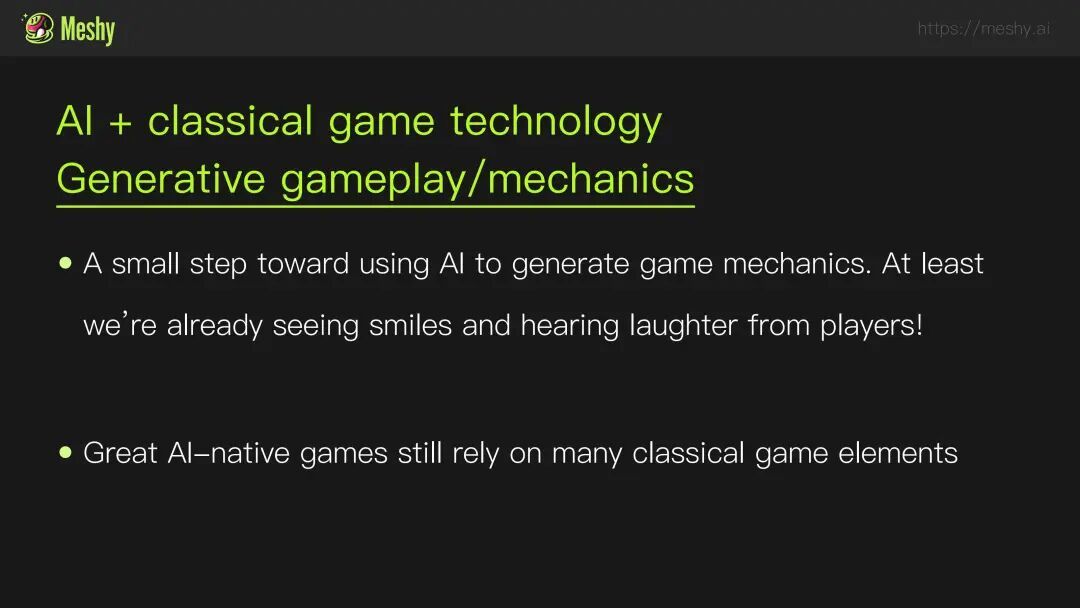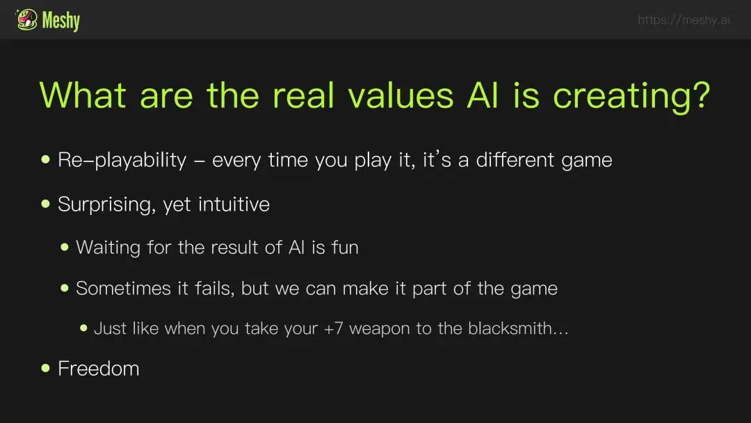 去年10月,葡萄君曾介绍过Meshy,当时的直观感受是,AI生成的质量有了长足进步,终于能成为生产力工具了;而这次GDC上Meshy的分享让我对AI生成如何融入游戏开发有了更清晰的认知。