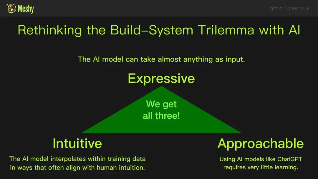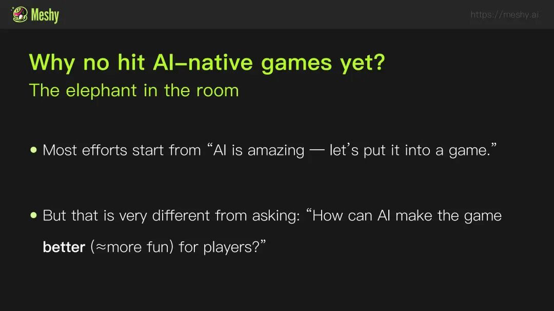 但不同于那种AI能够取代开发者或者直接生成游戏的论调,胡渊鸣在技术路线上更克制,强调把AI和传统工作流相融合:AI生成工具要一部分一部分地融入开发管线,AI生成的玩法要和传统游戏开发混合起来。和他们仔细聊过之后,我觉得这种克制和分寸,可能才是Meshy能跑通商业化的真正原因。