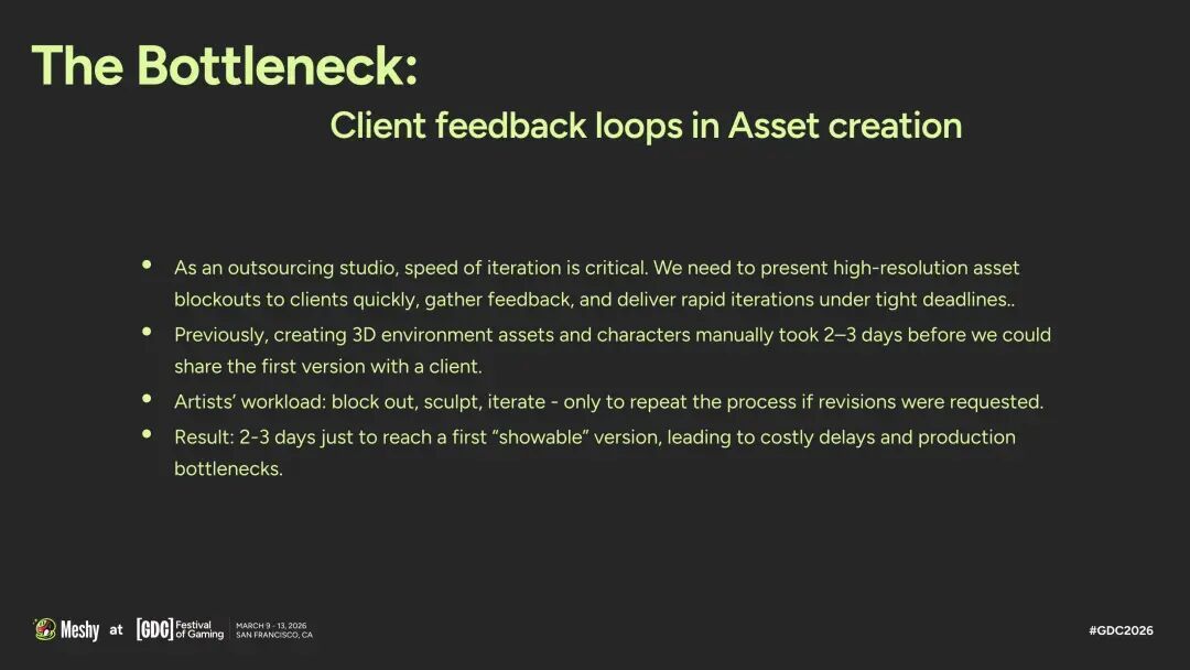这次GDC上Meshy的客户Technical Art Games(TransPerfect旗下的游戏外包公司)也提到了这方面的应用:以前做个角色测试需要两到三天,但有了Meshy,他们把原画放进Meshy,可以当天拿第一版网格给客户,迅速拿到反馈;在内部,他们的美术人员有时也会用Meshy生成模型放进MetaHuman里作为基础底模,加快概念验证。